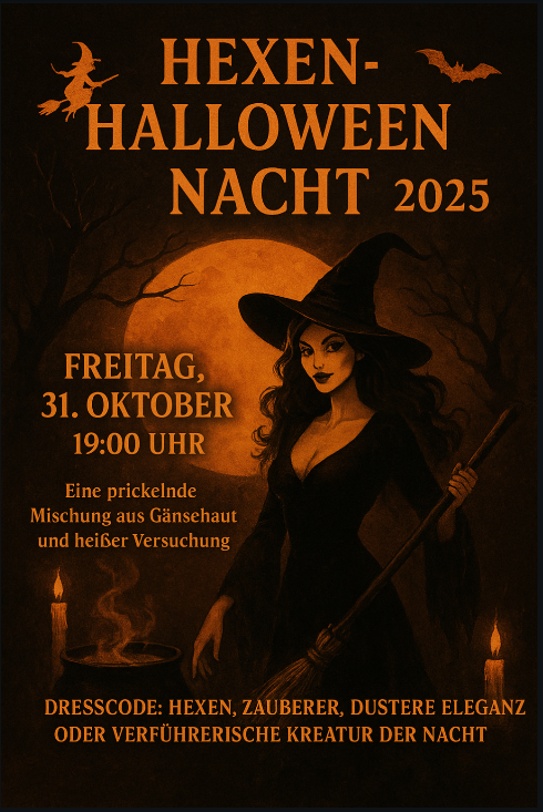 Am Freitag, den 31. Oktober 2025 ab 19.00 Uhr, wenn die Schleier zwischen den Welten dünner werden, öffnen sich die Tore zu einer ganz besonderen Nacht. Ab 19:00 Uhr tanzen nicht nur die Geister – auch wir beschwören eine prickelnde Mischung aus Gänsehaut und heißer Versuchung.